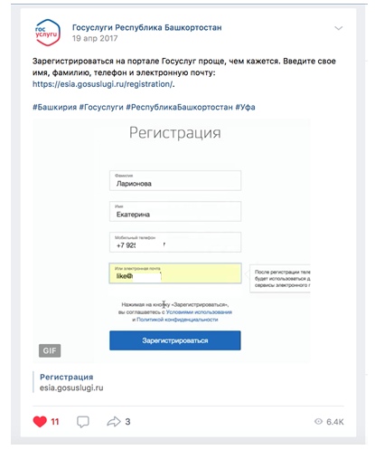 Такой прием мы использовали для рекламы сервиса «Госуслуги» в Башкортостане: подписчикам показывали, как зарегистрироваться на портале. Потрачено на запись GIF и написание текста было около 15 минут.